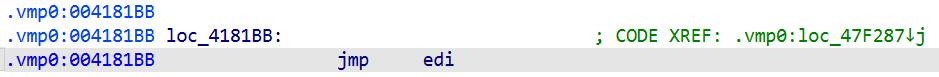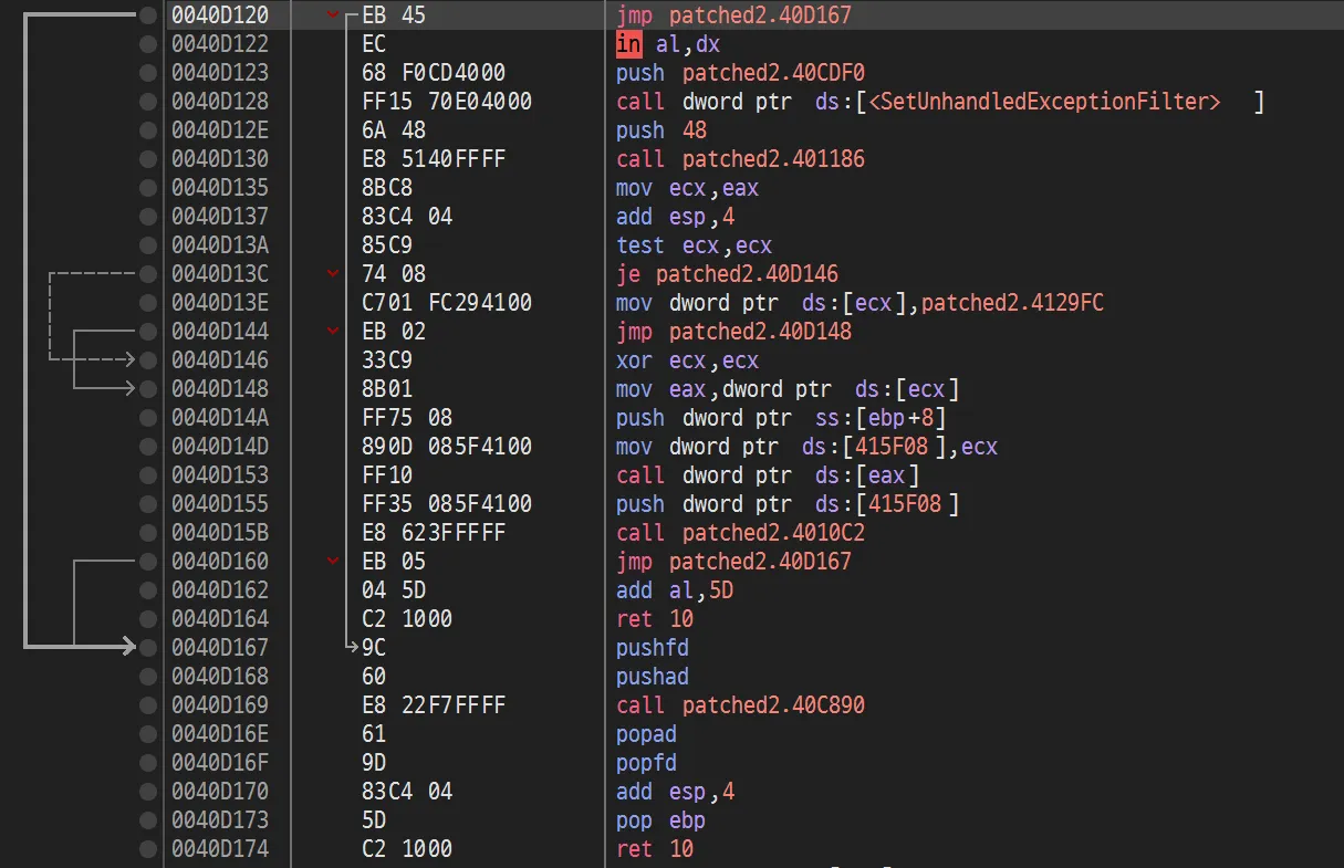 To compare before and after, I looked at the beginning of the .vmp0 region. Before patching, the section is filled with VMP-specific obfuscated code: meaningless operations and tangled jumps.