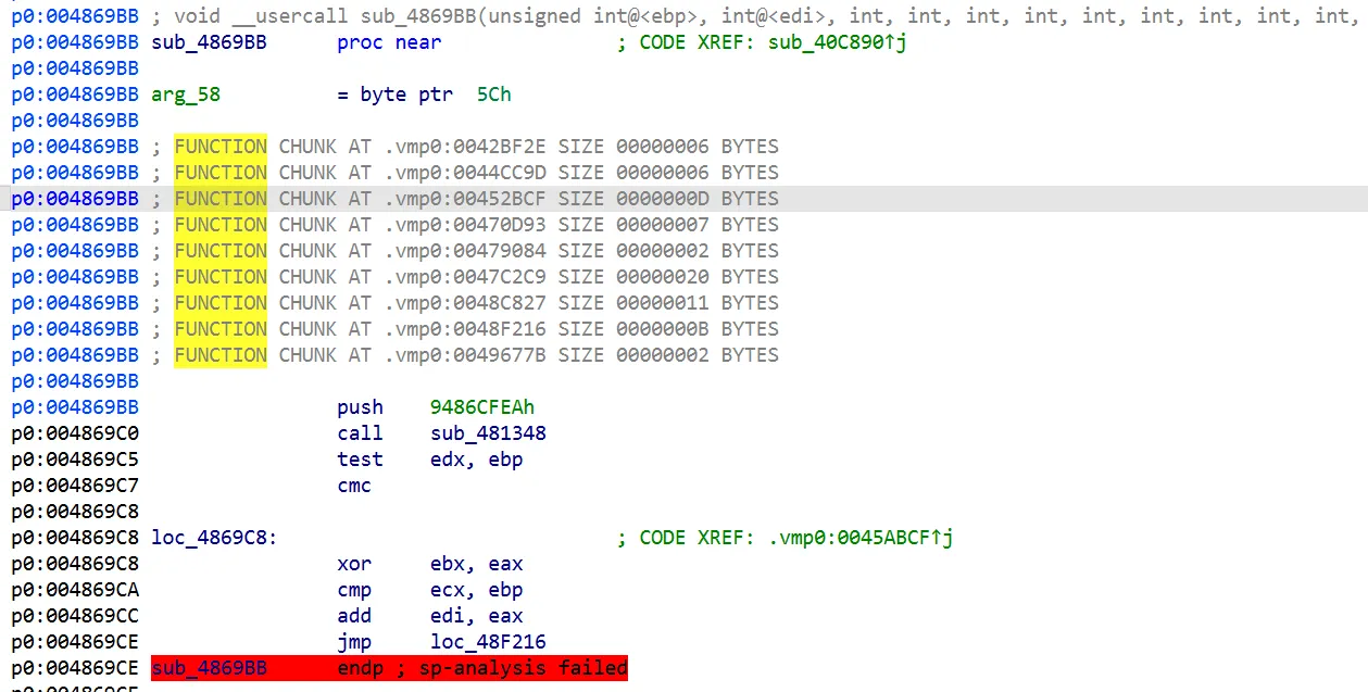 I will conclude with a screenshot showing the successful devirtualization. For the virtualized target function, I patched vir_Entry so that it jumps directly into the native code block I generated instead of the VMP dispatcher.
