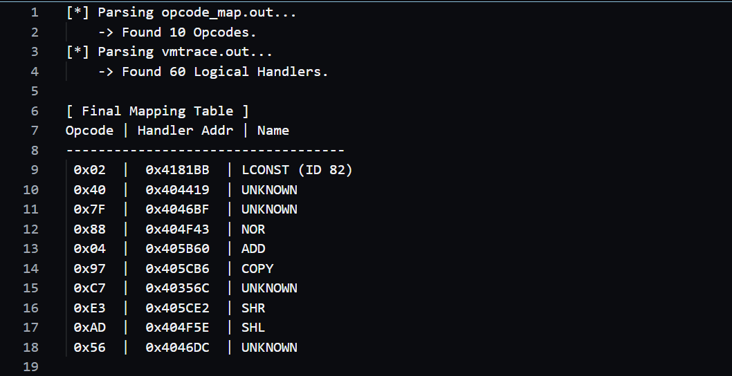 Parsing that opcode log together with vmtrace.out allowed me to reverse-map each opcode to a handler entry address. For example, the opcode corresponding to ID 82 turned out to be 0x02.