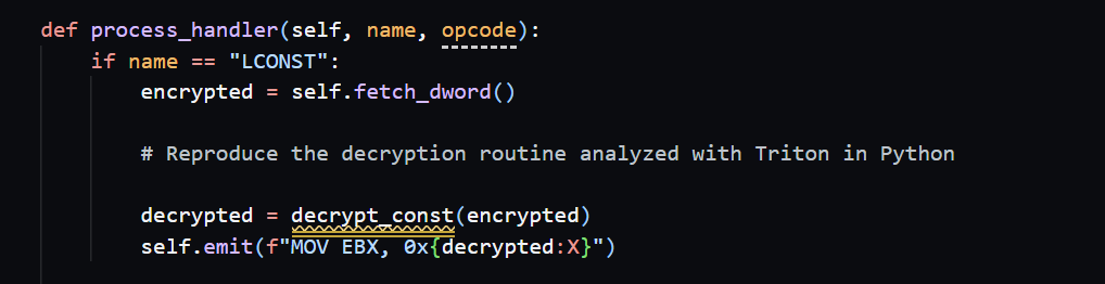 In the comments for each handler, I re-implemented the arithmetic sequence obtained by symbolically executing the handler with Triton, writing it out as 32-bit modular arithmetic in Python, as in the example above.