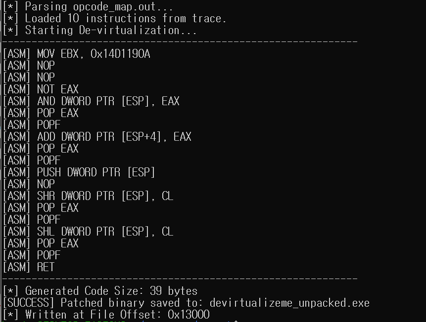 At this stage we now have a one-to-one mapping between VM bytecodes and the actual handler addresses. The final step is to build a dedicated devirtualizer that reconstructs the entire virtualized function as native x86 and patches it back into the binary.