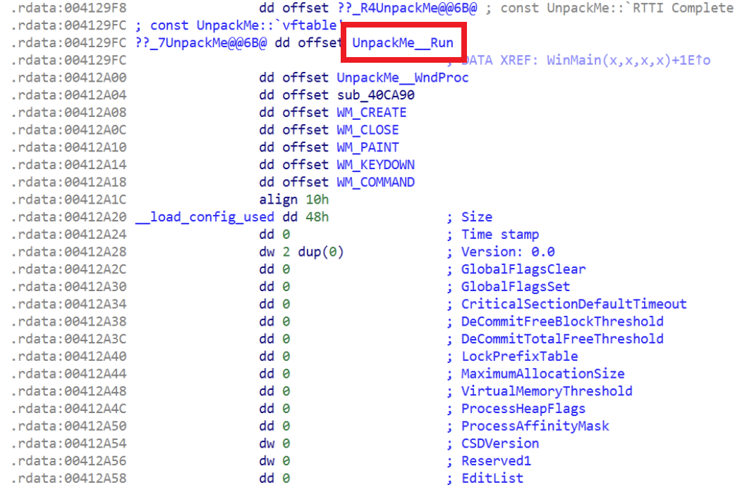 Following the vtable, we find that the C++ class UnpackMe’s vtable lives in the .rdata section. When IDA successfully reconstructs RTTI, it attaches the symbol ??_7UnpackMe@@6B@ and automatically names the first vtable entry as UnpackMe::Run. Let’s now jump into UnpackMe::Run, which opens the main loop.