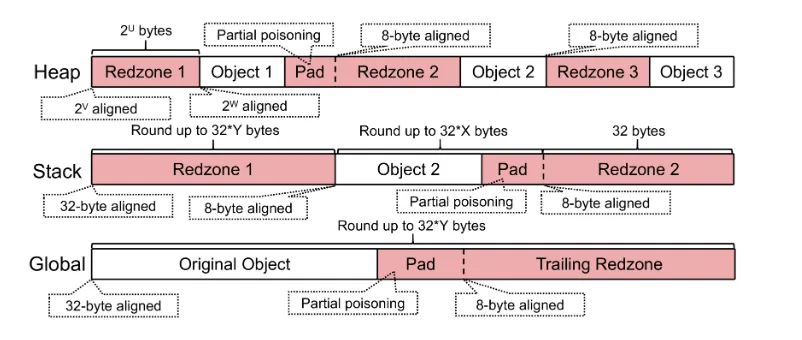 ASan에서는 다음과 같이 크게 3개의 감시 메커니즘을 사용합니다.