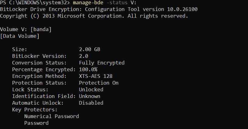 The screenshot shows the output of the manage-bde -protectors -get C: command, which lists the key protectors registered for the C: volume. The “numerical password” shown here is one type of protector used to unlock the VMK; it serves as a recovery mechanism when TPM-based unsealing fails in the normal boot path or when the system falls back into recovery mode. In other words, a BitLocker volume does not only contain encrypted data: it also stores, as part of its metadata, information about how the VMK can be recovered and the key hierarchy (VMK → FVEK), and ultimately relies on the FVEK to perform sector-level encryption and decryption.