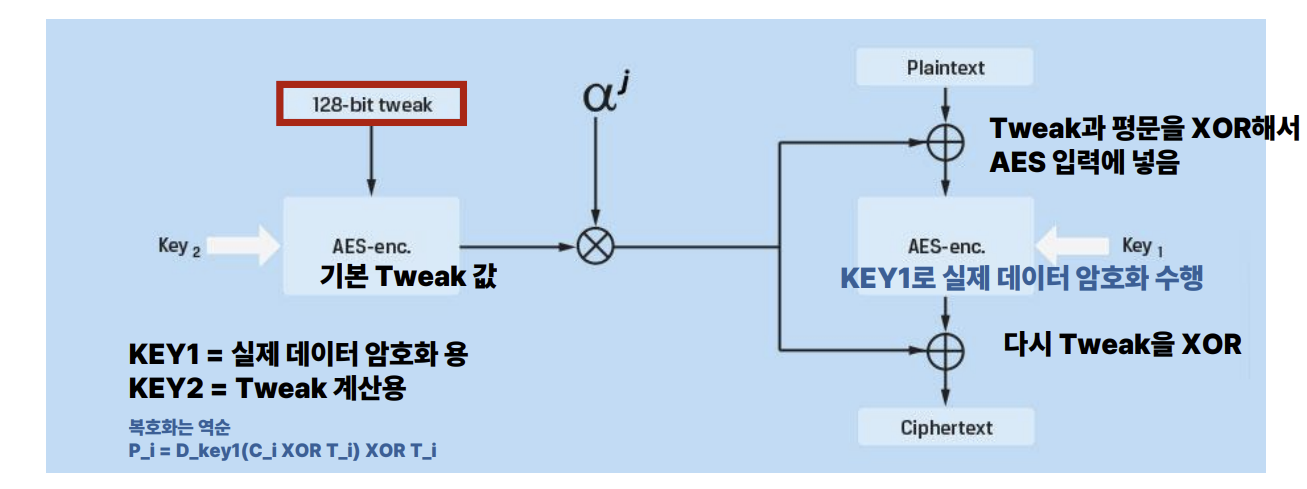 Checking the operation of XTS, XTS applies a value called a tweak to each block. This tweak is a value determined by the ‘disk location,’ usually based on the sector number and the block index within the sector. A disk reads and writes in sectors of sizes like 512B (or 4KB), and since AES is a 16B block, a 512B sector would be divided into 32 blocks. XTS is designed so that a different tweak is applied to each of these 16B blocks.