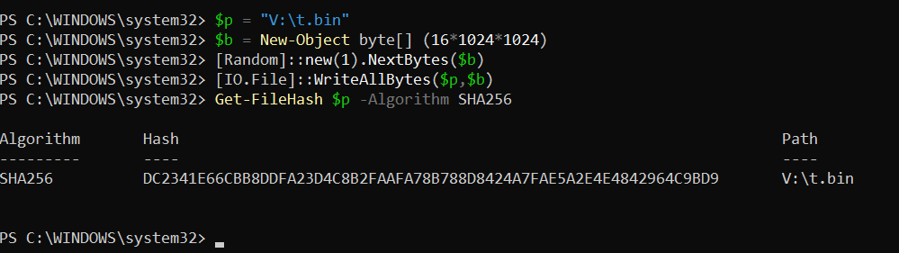 To verify this directly, we conducted a practical experiment to intuitively check the lack of integrity in XTS-AES on a BitLocker volume. First, we created a 16MiB file on a BitLocker-protected volume (V:), output its SHA-256 hash immediately after creation, and recorded it as the baseline. Then, with the volume locked, we directly edited the raw disk area to partially tamper with the 16-byte ciphertext block containing the file. After unlocking the volume again and recalculating the SHA-256 hash of the same file, we confirmed that the hash value had changed compared to the baseline.