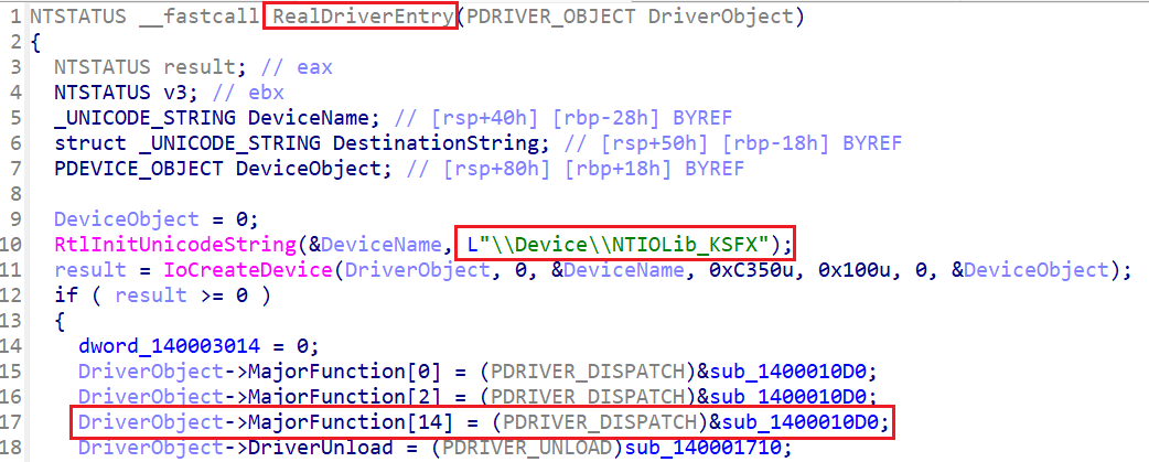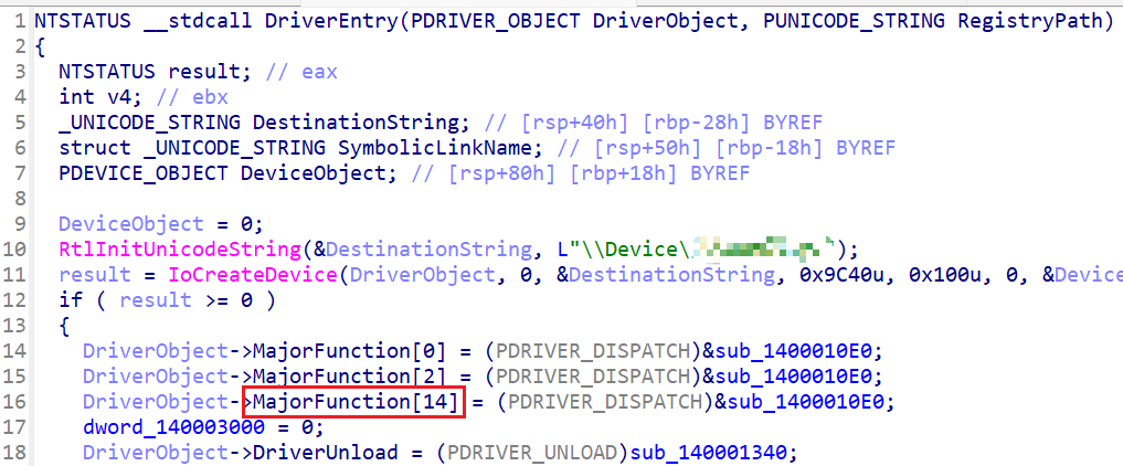Next, we need to check the driver’s permissions. To do this, we must know the DeviceName. I opened the driver file in IDA and located the DriverEntryto find the DeviceName. Additionally, it’s a good idea to check if MajorFunction[14] is present. MajorFunction[14] points to a function pointer that handles the IRP_MJ_DEVICE_CONTROL in the Windows kernel’s DRIVER_OBJECT structure. This indicates that a Dispatch Routine exists to handle calls to the DeviceIoControl API made by user-mode applications. Now, shall we check the permissions again?